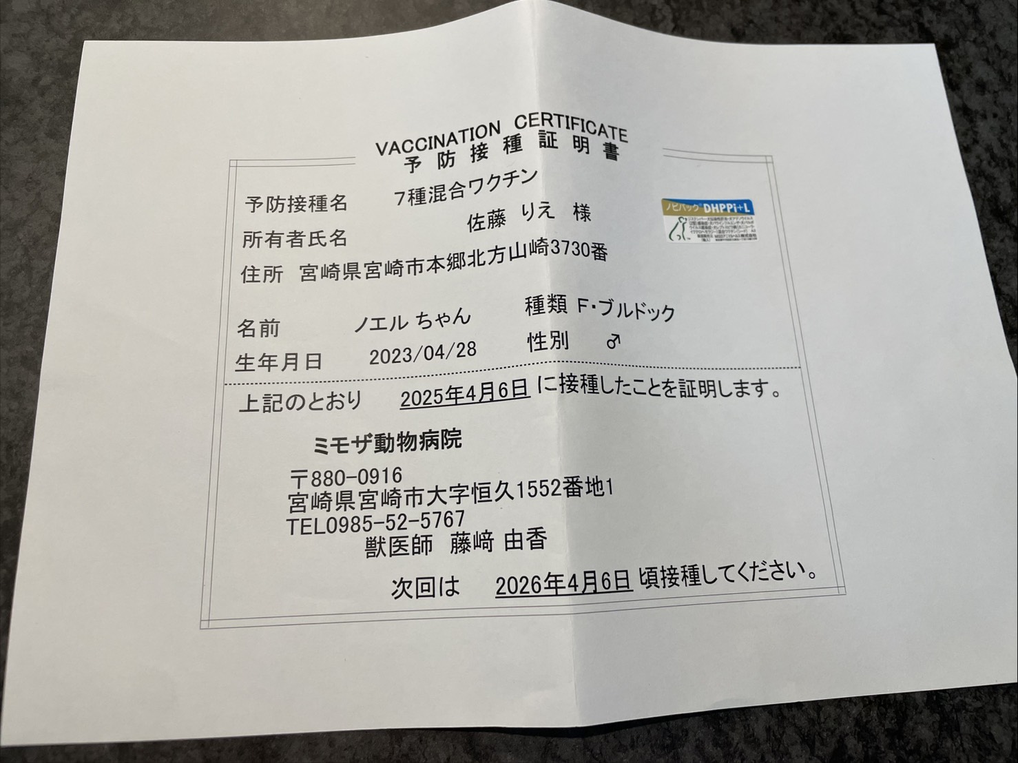 | 飼い主の住所 | 宮崎県宮崎市本郷北方山ア3730番地 |